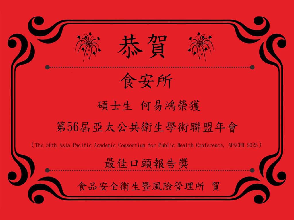 恭賀!食安所 – 碩士生 何易鴻 榮獲 【第56屆亞太公共衛生學術聯盟年會 最佳口頭報告獎】 Post Views: 46 更多訊息恭賀!食安所 – 楊書驊、朱孝揚榮獲【 全國三分鐘生科論文口說競賽南區優勝 】2025-11-11恭賀!食安所 – 黃睿呈榮獲【 Poster Award 】2025-11-11115 食安所招生口試-口試名單&時間/地點2025-10-2110/2 | 演講公告:台灣農地重金屬污染土壤整治管理與食米健康風險評估2025-09-189/25 | 演講公告:從農藥參考劑量(ADI/ARfD)訂定到蔬果殘留容許量(MRL)之暴露風險2025-09-18恭賀!食安所 – 畢業生 陳萩錦 考取【考取114年普通考試 衛生行政類科】2025-09-18
