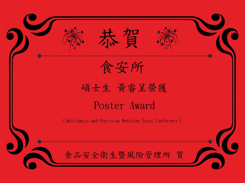 恭賀!食安所 – 黃睿呈榮獲【 Poster Award 】 Post Views: 42 更多訊息恭賀!食安所 – 楊書驊、朱孝揚榮獲【 全國三分鐘生科論文口說競賽南區優勝 】2025-11-11恭賀!食安所 – 碩士生 何易鴻 榮獲 【第56屆亞太公共衛生學術聯盟年會 最佳口頭報告獎】2025-11-11115 食安所招生口試-口試名單&時間/地點2025-10-2110/2 | 演講公告:台灣農地重金屬污染土壤整治管理與食米健康風險評估2025-09-189/25 | 演講公告:從農藥參考劑量(ADI/ARfD)訂定到蔬果殘留容許量(MRL)之暴露風險2025-09-18恭賀!食安所 – 畢業生 陳萩錦 考取【考取114年普通考試 衛生行政類科】2025-09-18